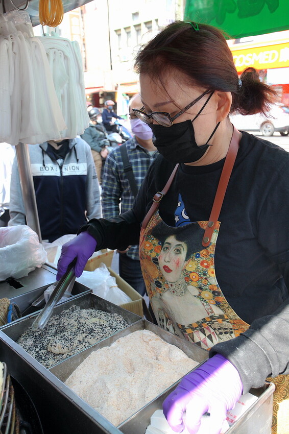 炸好白糖粿交給旁邊小姐來沾糖粉,順便結帳拿著白糖粿慢慢享用。