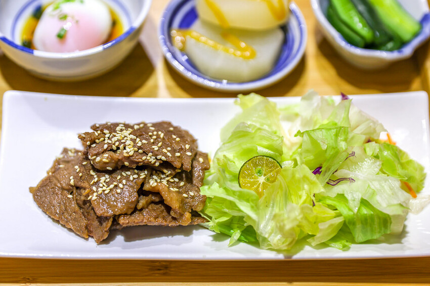 每份定食都有附白飯、湯品、小菜、沙拉和溫泉蛋,也可加價升級套餐,我之前吃都會升級,但這天通通賣光。單點飲料也會折價30元