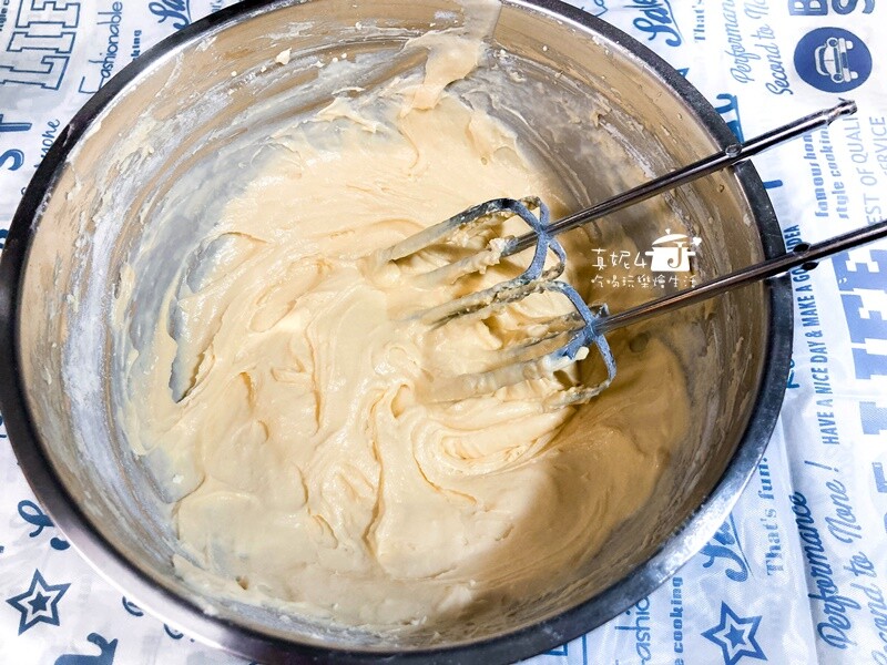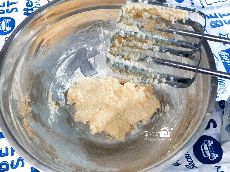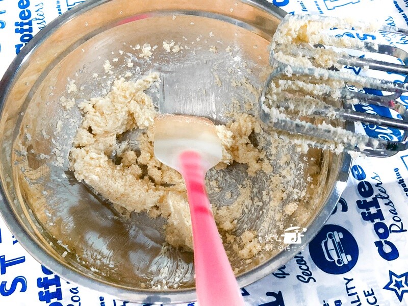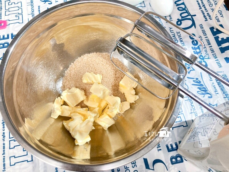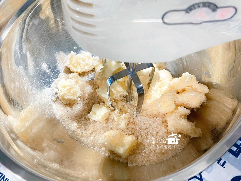 1. 無鹽奶油加入細砂糖用電動攪拌器打到乳白色。同時烤箱以180度C預熱