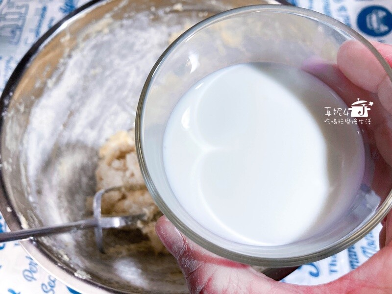 先用攪拌柱分次輕手的混拌至漸無粉粒後續加入牛奶再繼續拌合到沒有塊粒的狀態