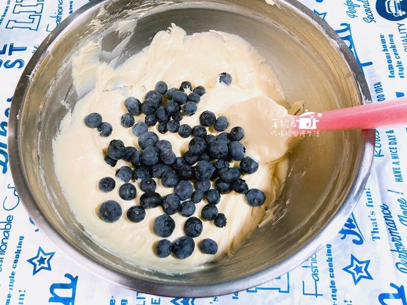 4. 把洗好且擦乾的新鮮果粒加入麵糊裡,用刮刀再一次輕手混拌