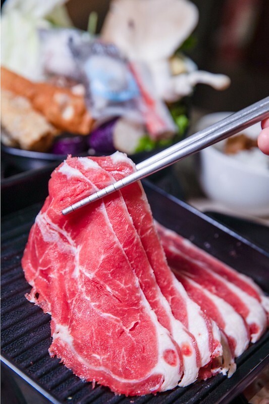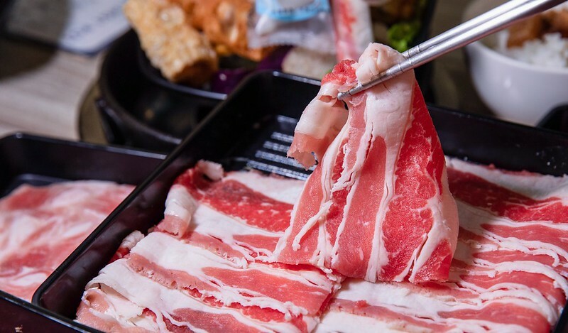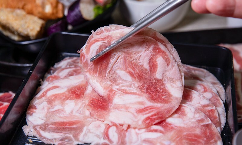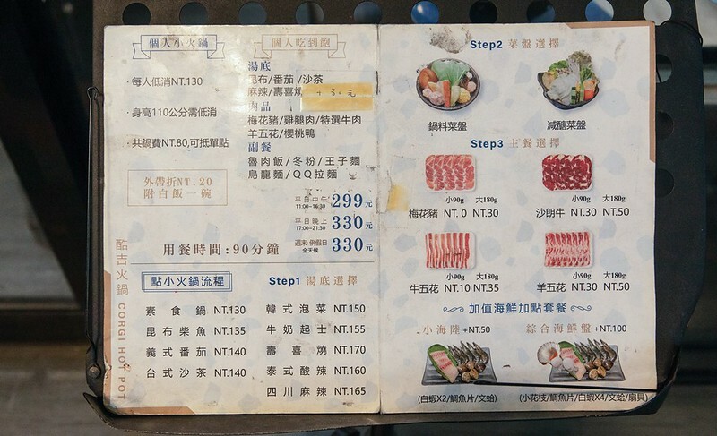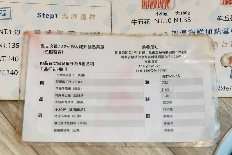 火鍋吃到飽中午299元,晚上則是330起,不收服務費且一個人就能開鍋,但一個人可能得能接受和別人並桌(有自己單獨一鍋),光是肉品就有八種可以選擇,後面都有註明各種肉品來自那個國家,特別要提醒的是安格斯背肩牛以下的三種要加30元,心想也才30元,就直接攻頂了。另外,想吃海鮮得+99元,對不是那麼好海鮮的肉控如我而言,分開反而是好事,因為我壓根就不想吃海鮮,只想專心攻肉。最後就是用餐時是100分鐘。