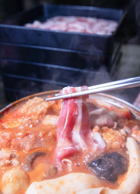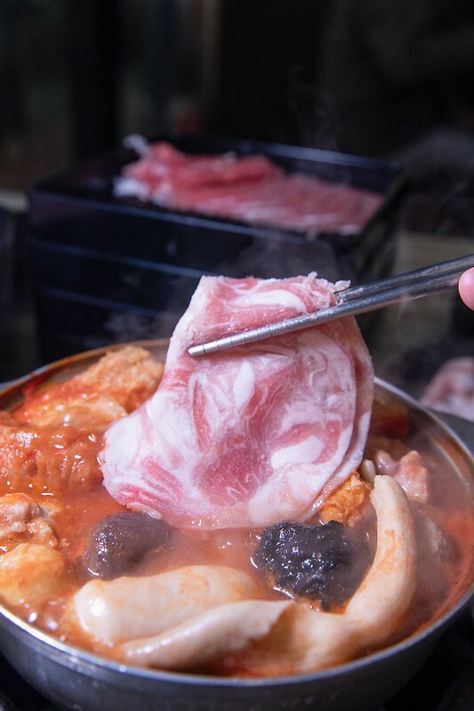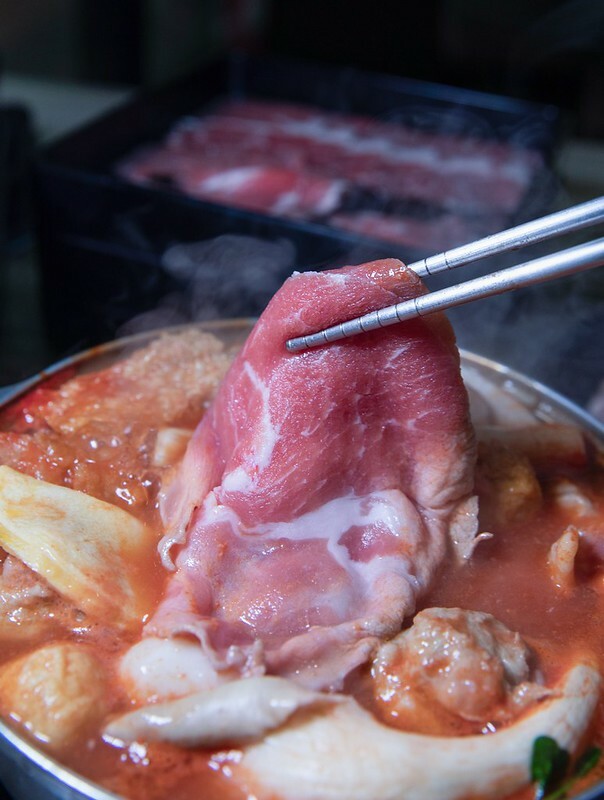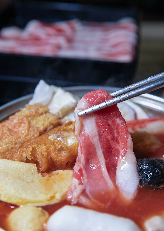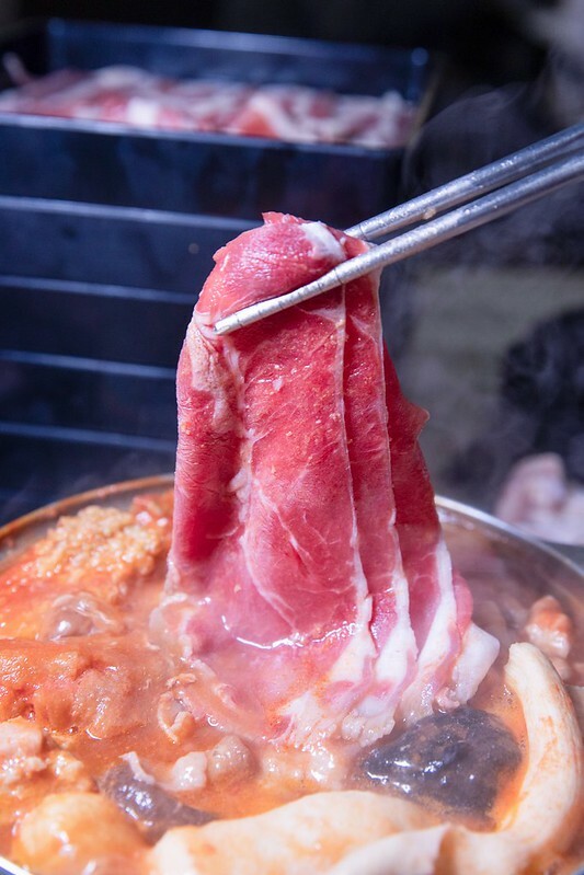 濕式熟成板腱肉,這塊就比較適合不那麼好吃牛油花的朋友,肉嫩肉甜度那也是翻了倍,吸了湯汁後更顯飽嘴的很,但不管是那個部份的牛肉都不建議整體丟下去煮,一來不好撈找,二來會很嚴重縮水,進而影響口感。因為這裡的肉片都不算切很厚,湯有滾涮三秒左右就可以入口。正好,正熟、正甜、正好吃。