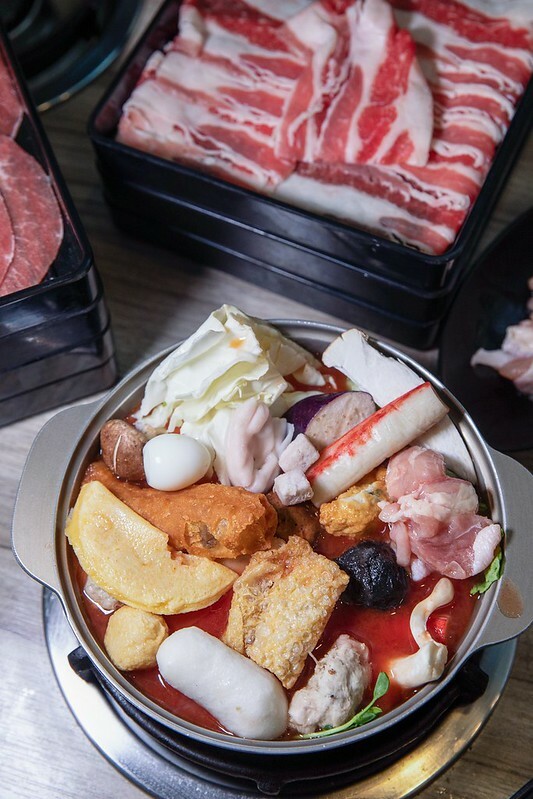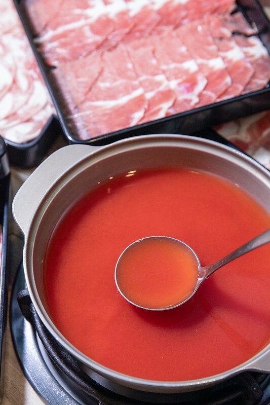 火鍋湯底有昆布、番茄、沙茶、麻辣、壽喜燒5種,最後我挑了酸甜蕃茄鍋,湯頭微酸略帶甜和一點點鹹味,比我想像中清爽許多,涮肉不會吃味,涮蔬食又像多了一味。