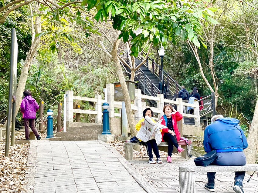 兩旁都是樹蔭,大約走10分鐘左右,你就會看到有階梯了。許多老人家也會在這邊一旁的石椅上看報紙、休息。