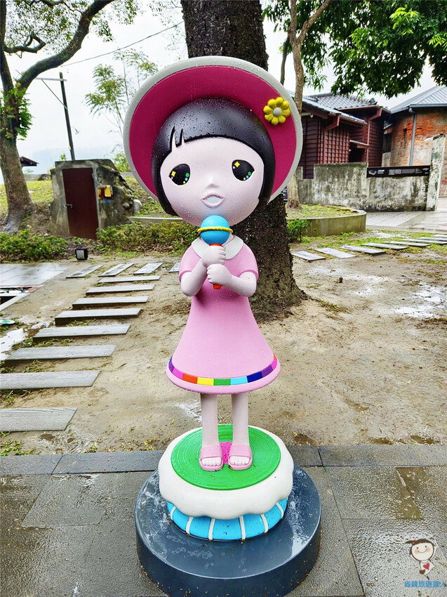 故事館的庭院還有這尊身著粉紅洋裝,手拿麥克風的帽子歌后Q版娃娃