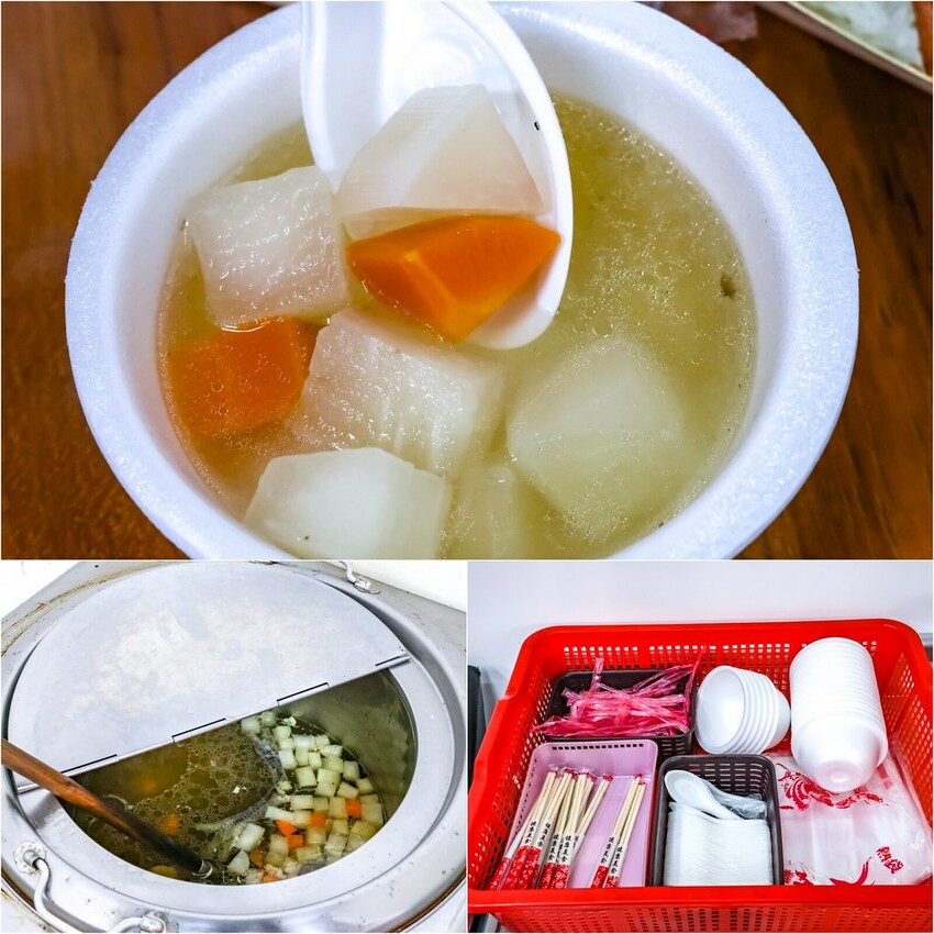 自助區有免費的湯品喝到飽,外帶可以自己包,這天喝到很好喝的蘿蔔雞湯,撈湯的時候看到好幾隻雞腳,還有客人直接把雞腳當滷味來啃,比較可惜是內用保麗龍不環保啦~