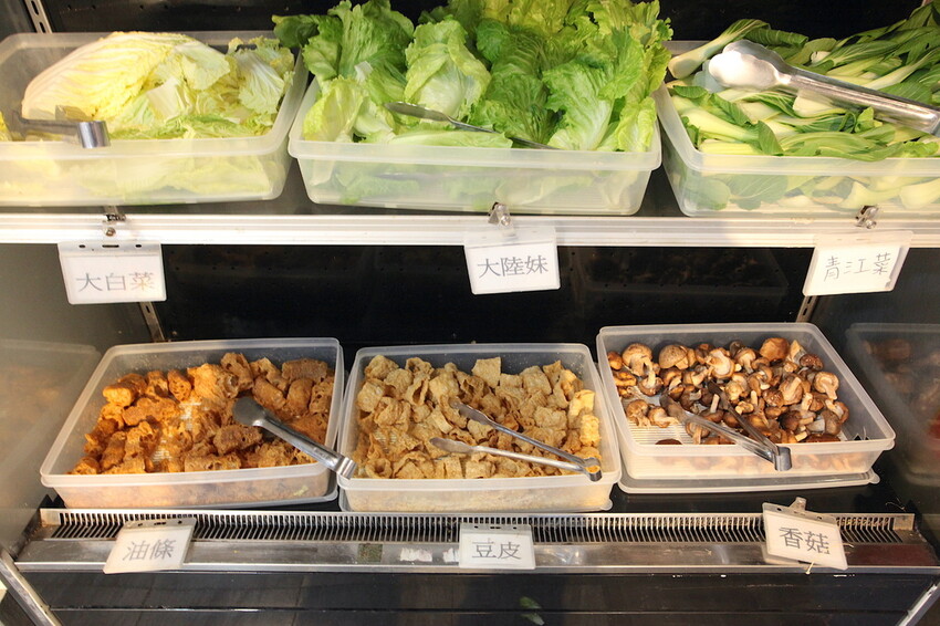 這12樣分別是杏鮑菇、油豆腐、袖針菇、金針菇、木耳、蒟蒻、青江菜、大陸妹、大白菜、香菇、豆皮及油條等。