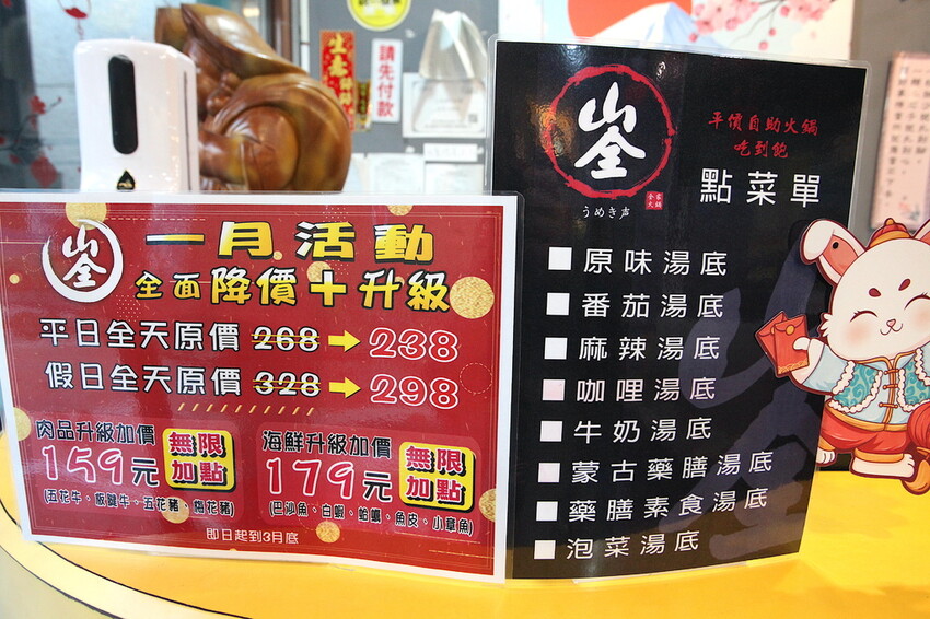 櫃檯上有擺放菜單供顧客點餐參考,因吃到飽菜單相對的比較簡單,菜單吃到飽分平日238元及假日298元,另外一張菜單是選擇想要的湯底,湯底有原味、番茄、麻辣、咖喱、牛奶、蒙古藥膳、藥膳素食及泡菜等8樣湯底供選擇。