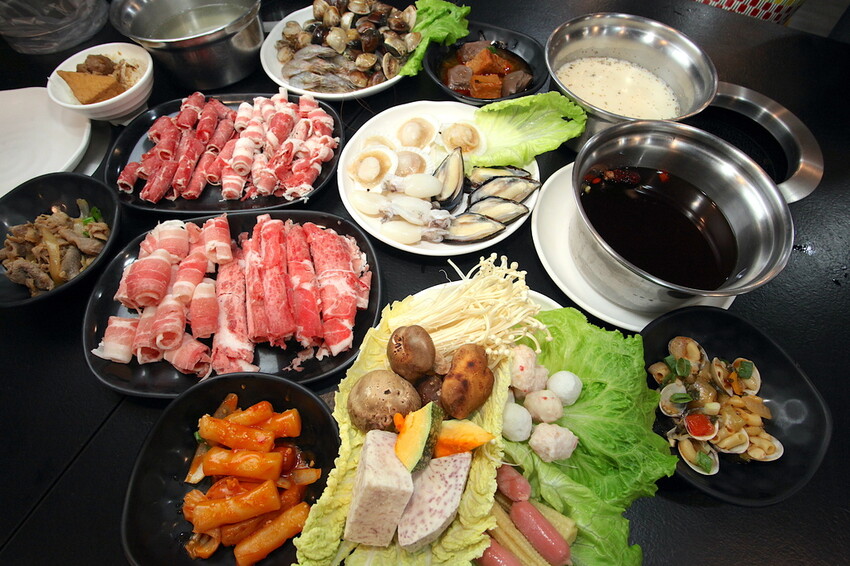 把主要的餐點和食材擺放桌面上拍照,小高今天選擇原味、牛奶及蒙古藥膳三樣湯底。