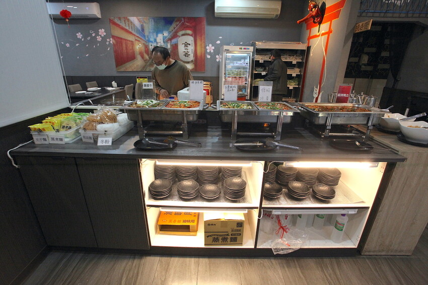 店面後方有設置免費自助區,木櫃下方有放置餐具供顧客自取,現在自助吧再進化供應更多的食材。