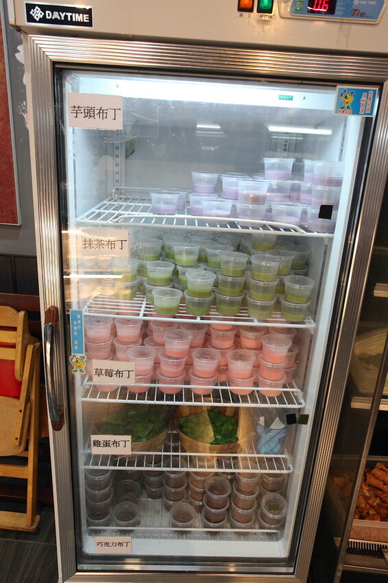 這冷藏冰箱裡有五種布丁供選擇,有芋頭布丁、抹茶布丁、草莓布丁、雞蛋布丁及巧克力布丁等。