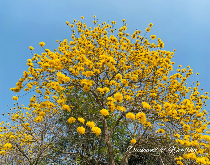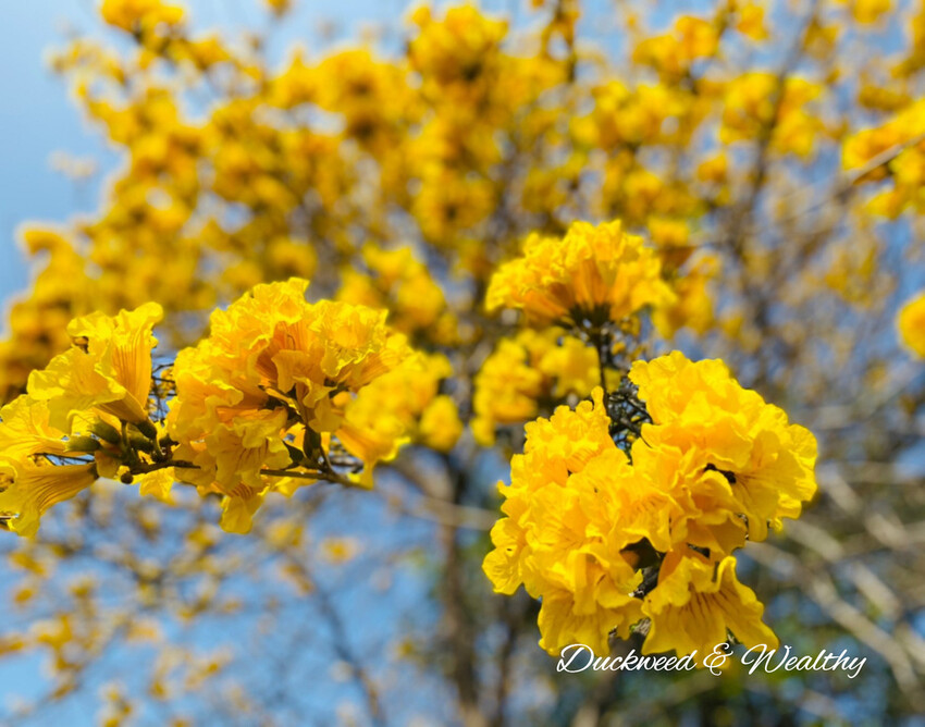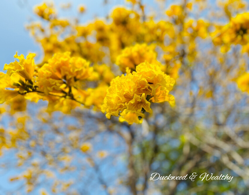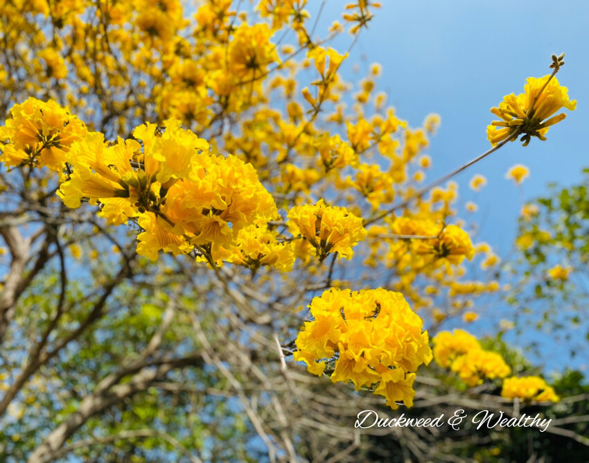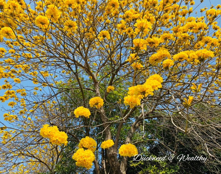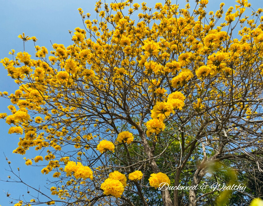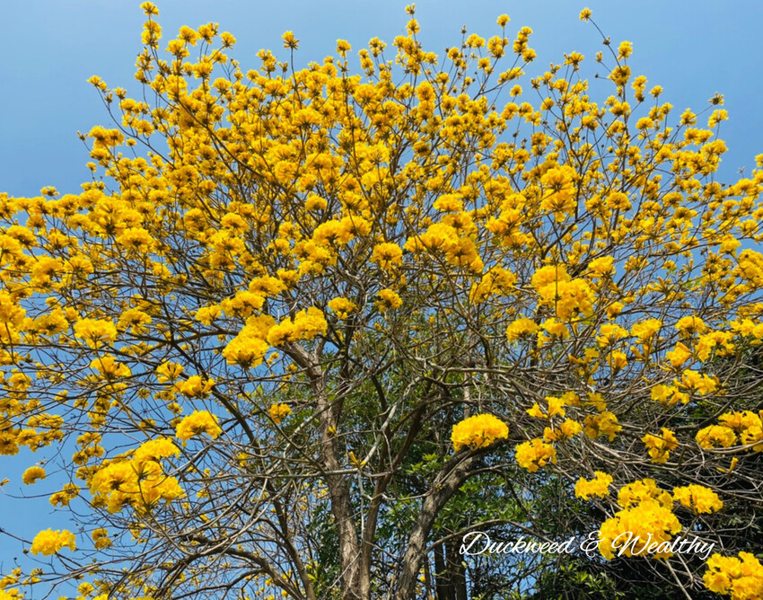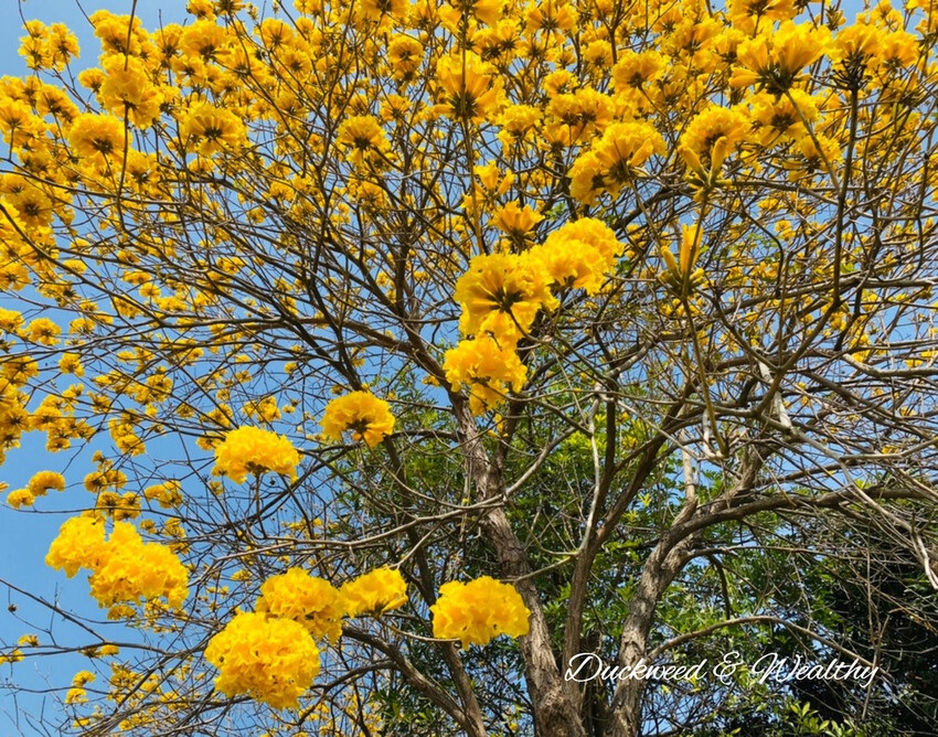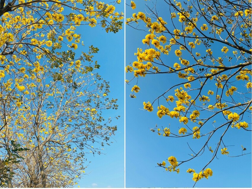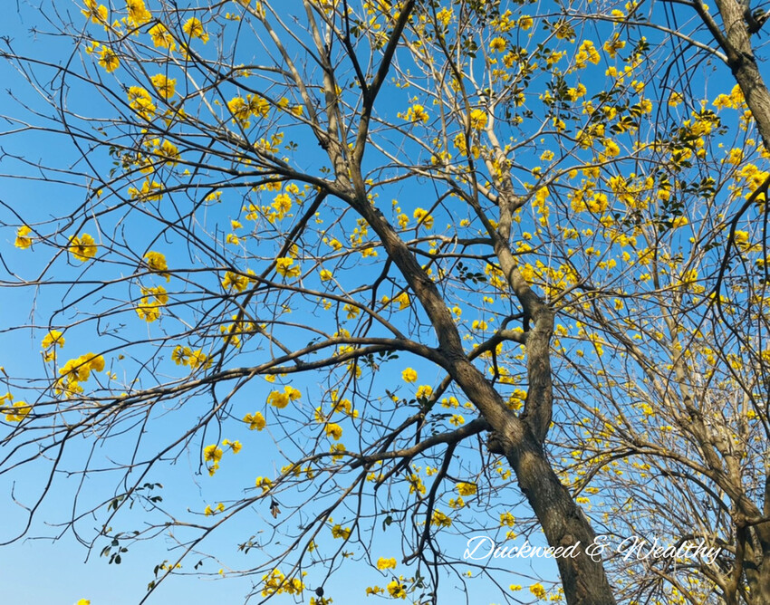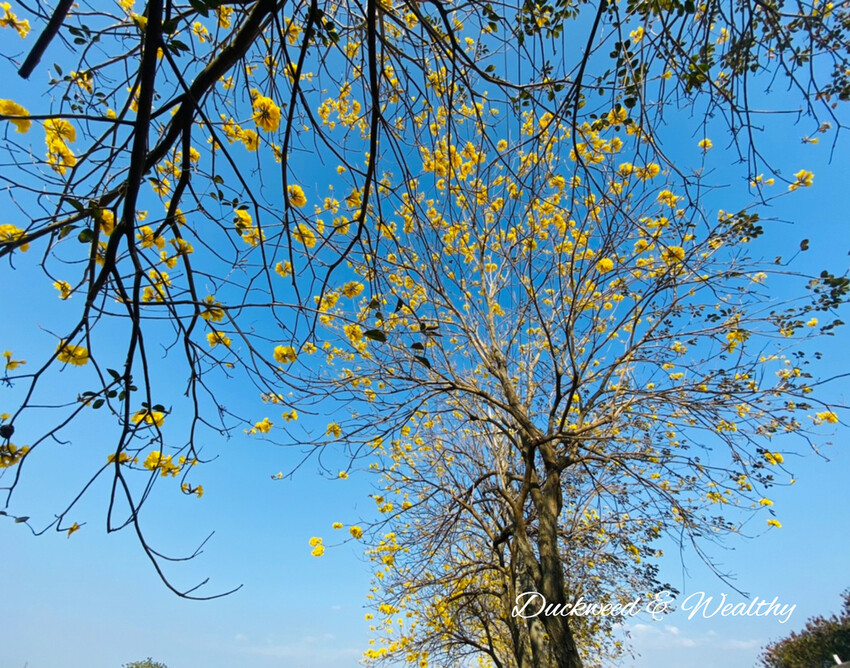 [黃花風鈴木]往年的盛開時間大多落在228至3月中,藍天白雲中、黃花伴隨著微風飄動,