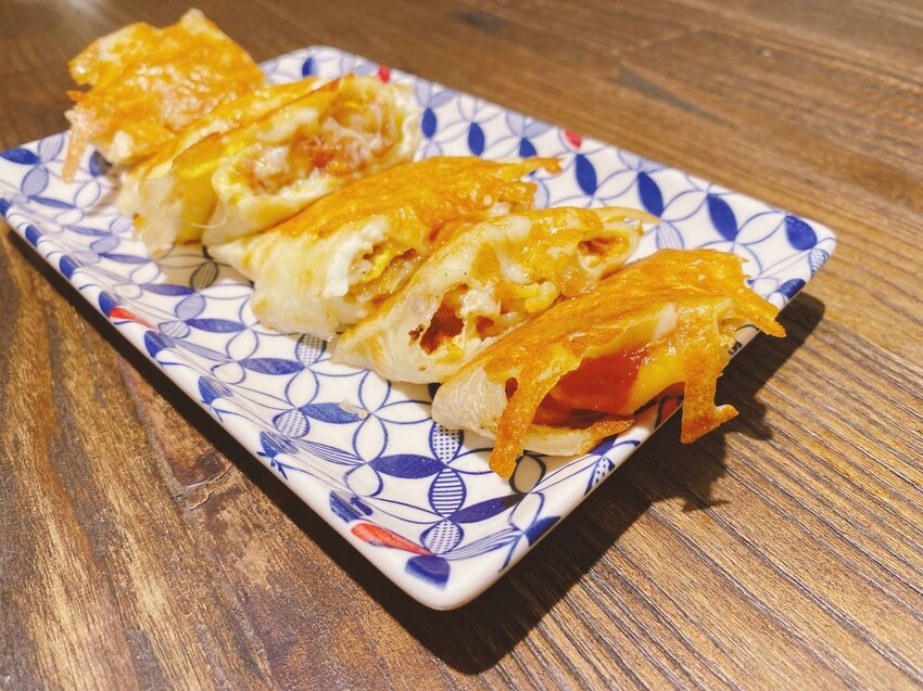 手打的麵糊蛋餅,煎得好金黃,再包上無敵的薯餅和乳酪,超好吃的啦~