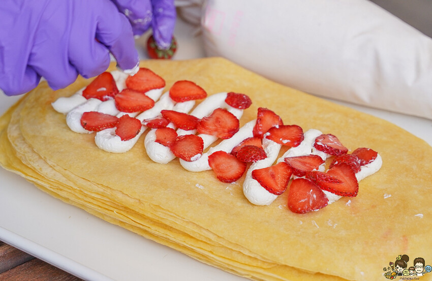 草莓都當天新鮮清洗、切片,堆疊於鮮奶油上
