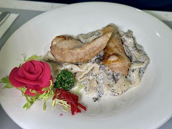 桃紅色玫瑰花,是火龍果洋芋泥,