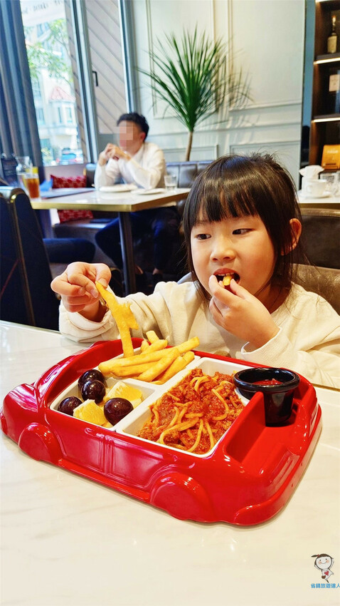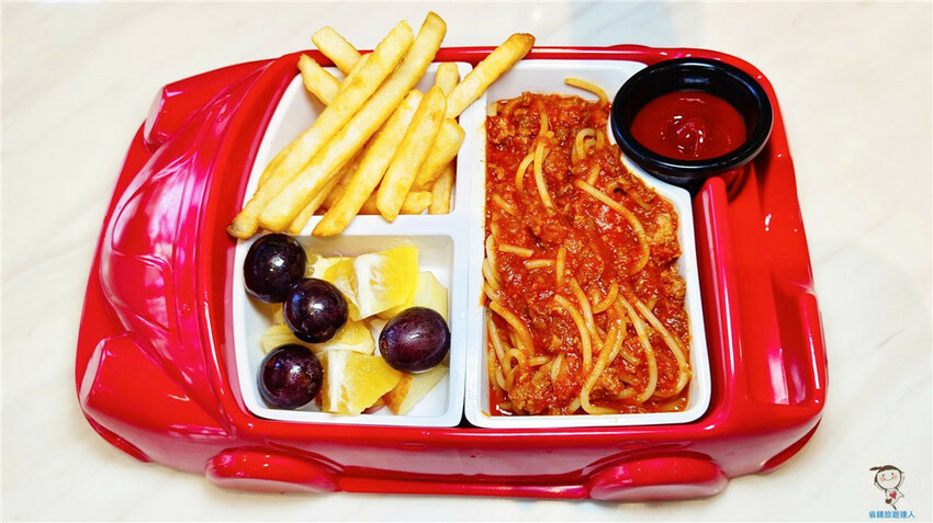 用汽車造型餐盤來承裝食物的兒童餐,包括義大利麵,薯條和現切水果
