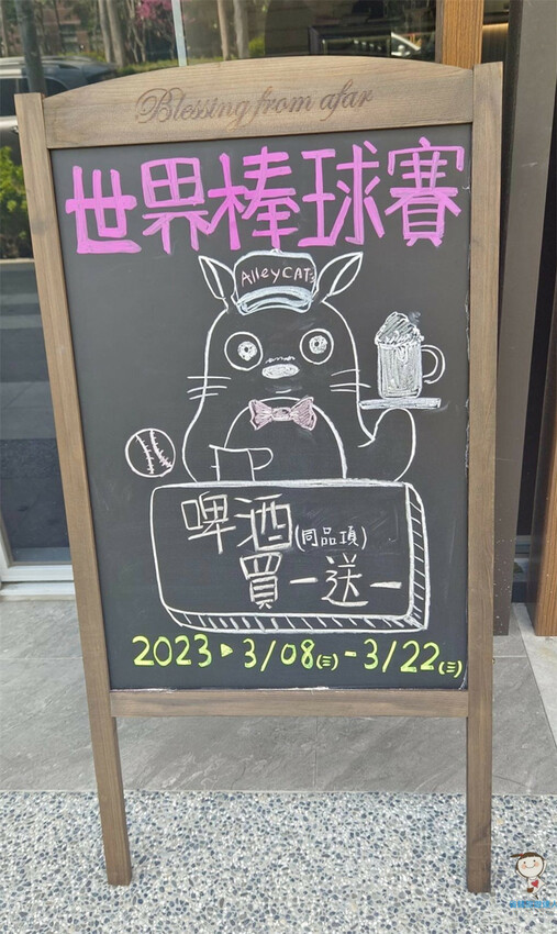 門口的小黑板畫了隻可愛的貓咪,告訴大家3/8~3/22同品項啤酒買一送一🍺