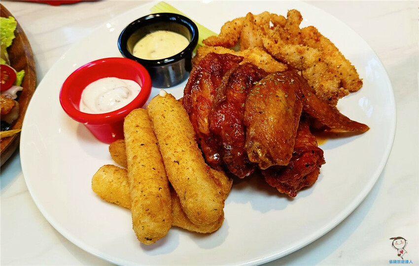 包括炸起司條,炸魚和烤雞翅,還有二種沾醬可以沾著吃