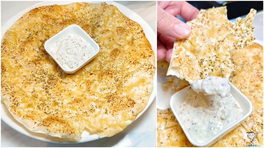 品嘗起來更是意料之外的驚喜,原本就帶著蒜香的脆餅,沾了凱撒醬後滋味更美妙了
