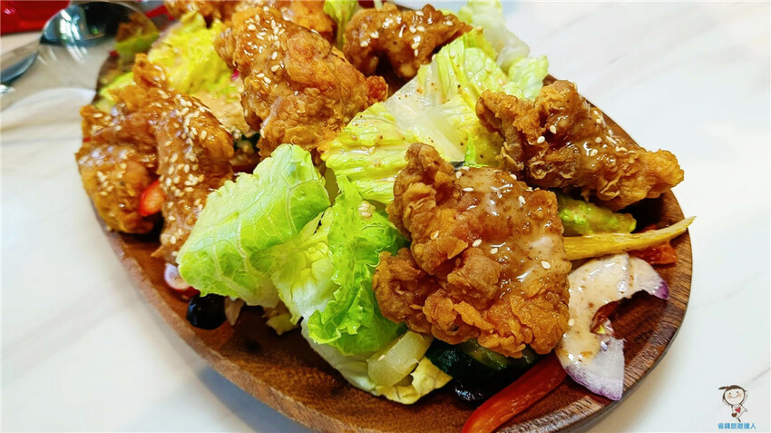 炸得酥脆的大塊雞肉,搭配各種新鮮蔬菜,分量還不小,大約可供3~4人一起分享