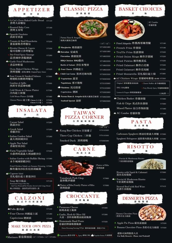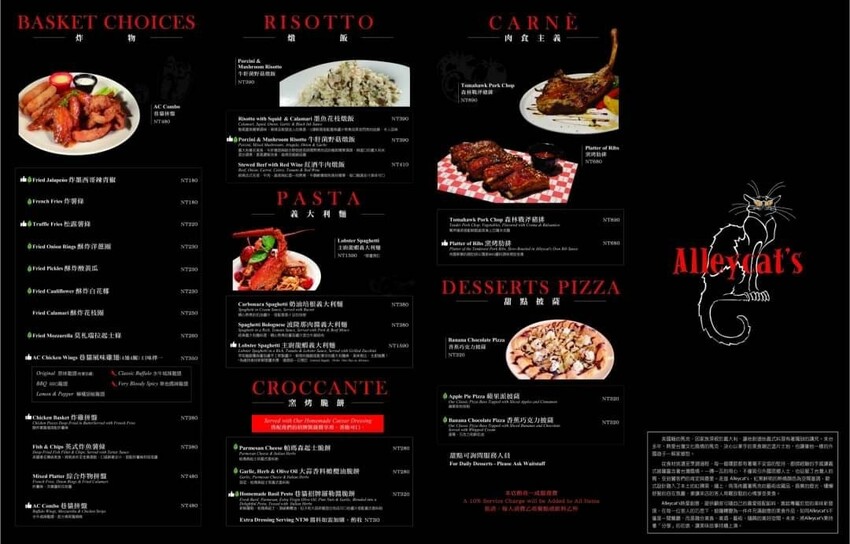 Alleycat’s提供的餐點相當豐富,第一頁包括開胃菜,沙拉和各種經典披薩