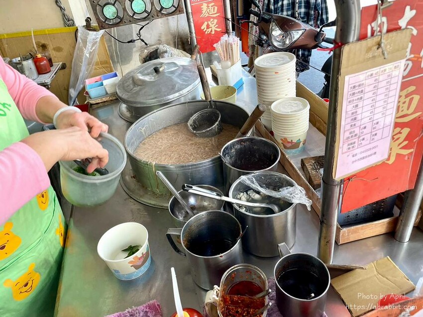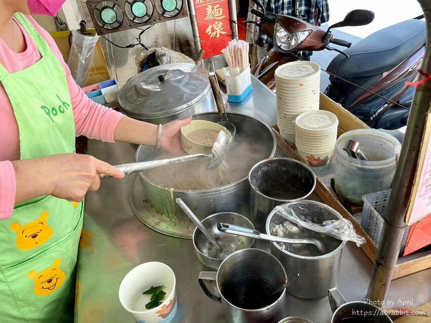 除了賣葷的麵線以外,這家也有賣素食麵線唷!我們當天點了小碗的麵線,老闆會先在碗裡放九層塔,再舀入麵線到碗裡。