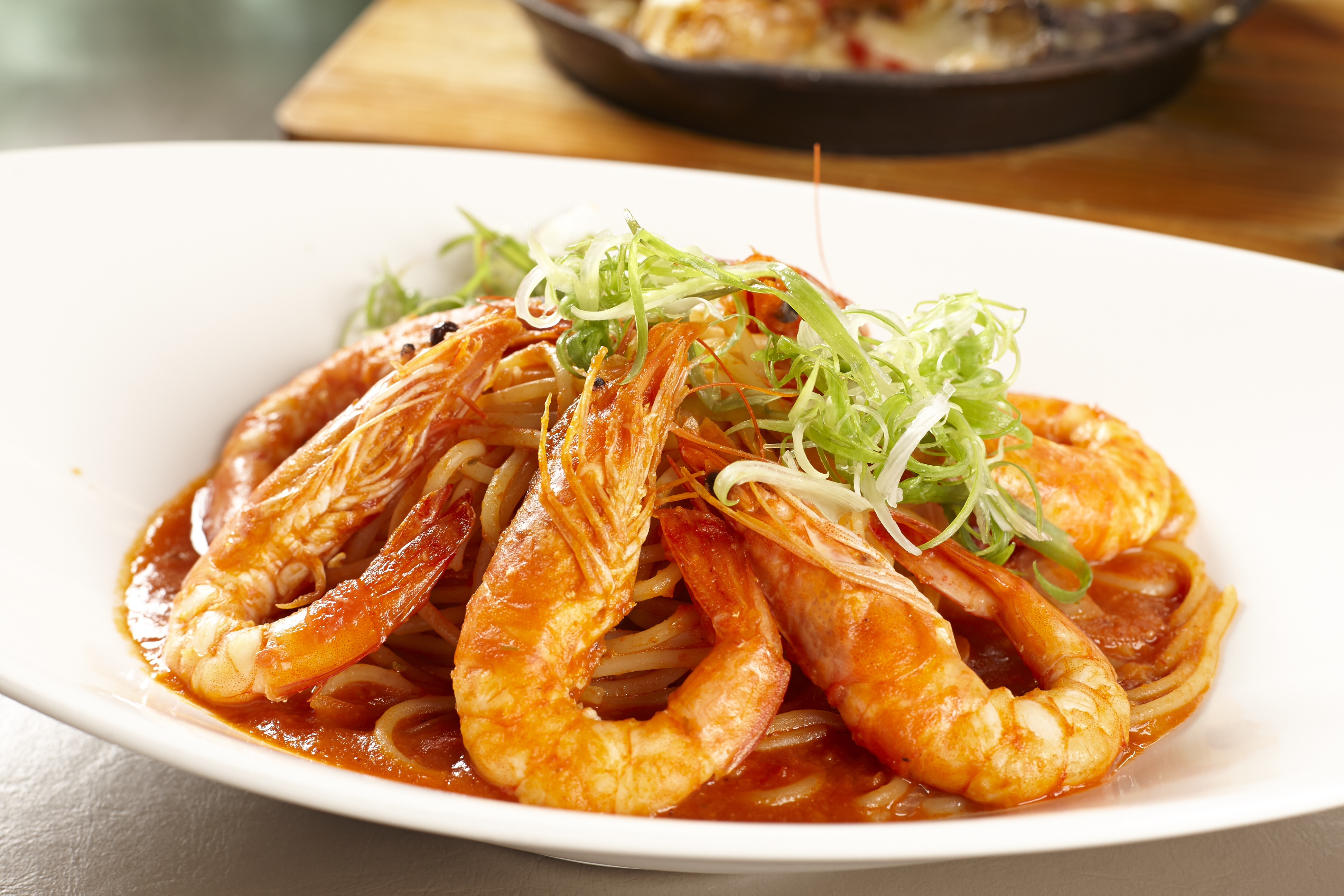 去殼的鮮蝦由師傅每日親選,格外嚴格要求鮮度,蝦肉鮮美彈牙,佐以番茄醬汁為基底,味稠蝦甜。品嚐起來別具風味,加入大蒜增加口感,更為鮮香四溢,酸甜番茄和肥美海鮮交織豐美層次。
