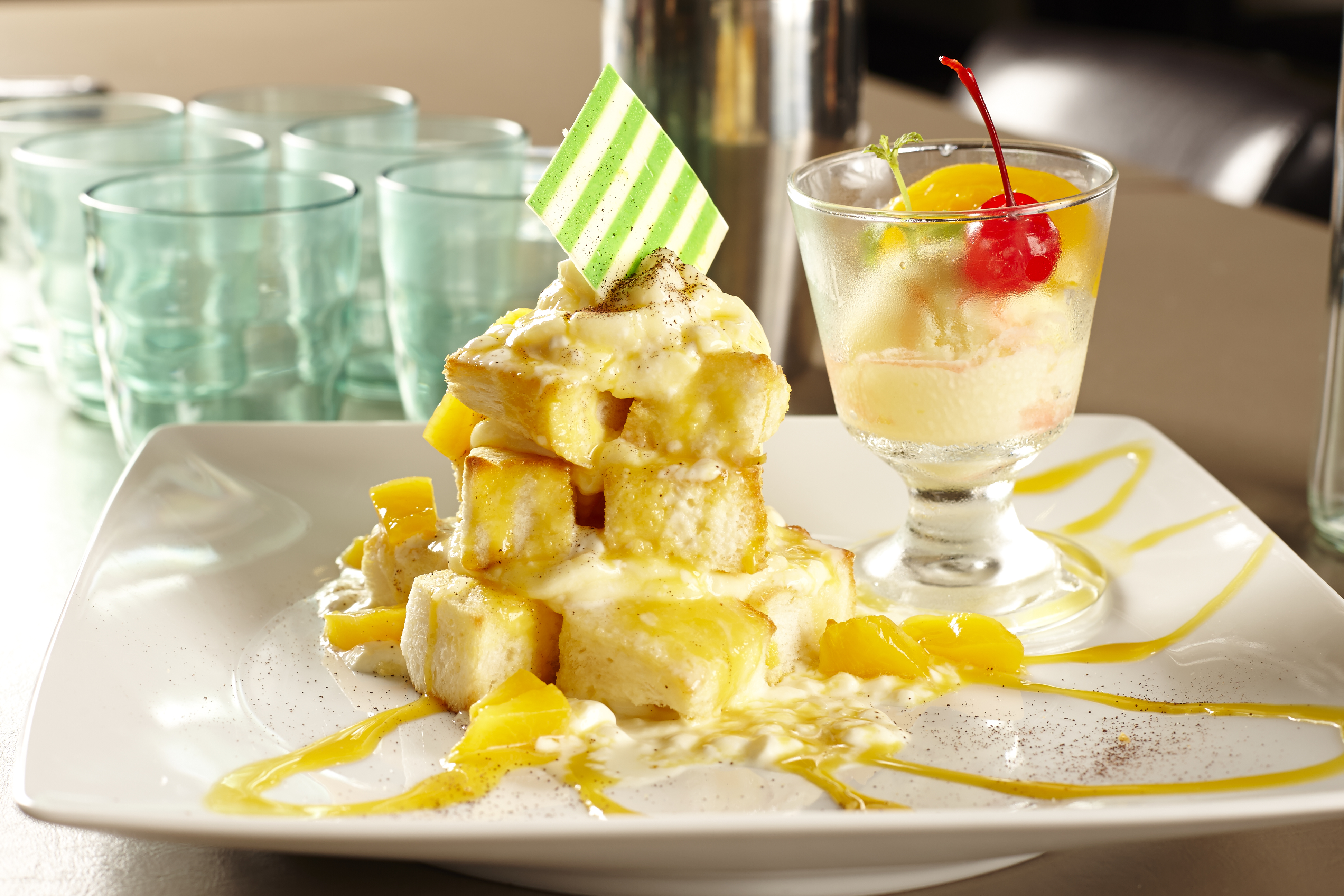 嚴選麵香十足的厚片土司,平均切分為方塊磚形,也以此為命名,耐心考至金黃色,口感酥脆,再淋上甜點師傅特調的奶香芒果醬與提拉米蘇醬,搭配水蜜桃與香草冰淇淋,層層堆疊出多層次的和諧口感。