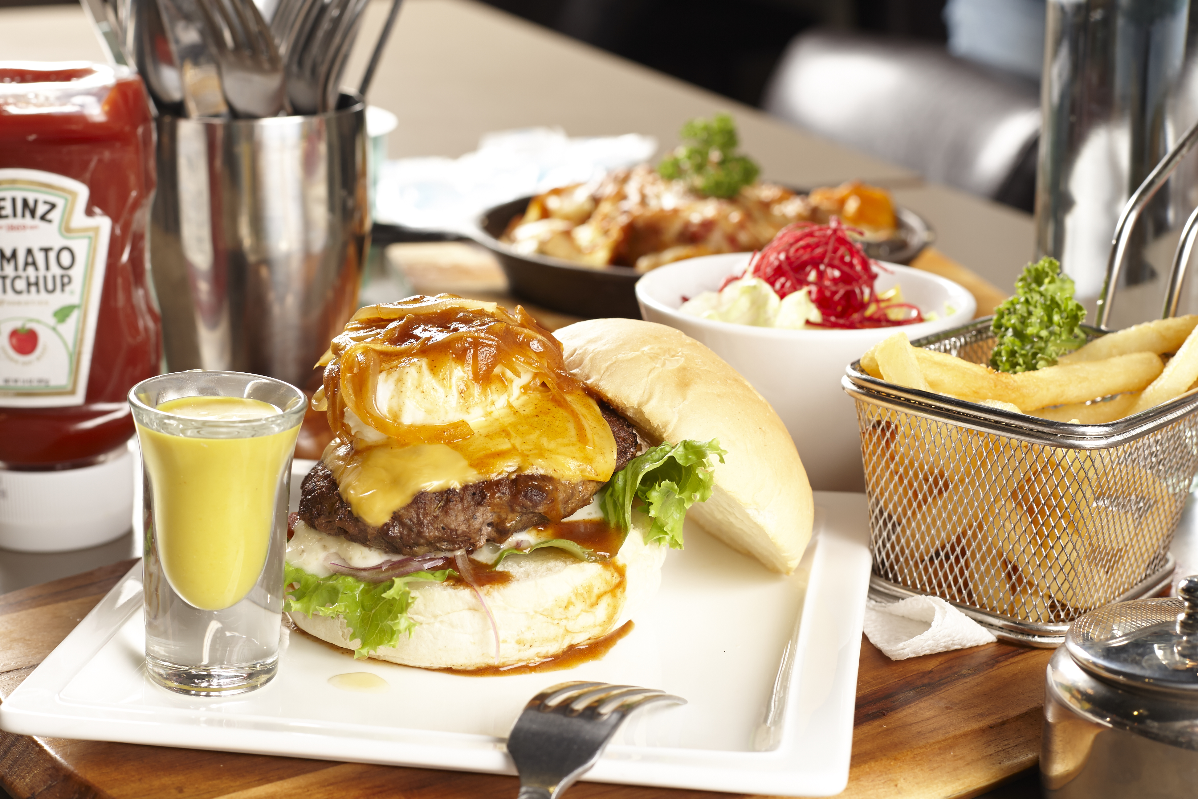 店內隨時提供各種現點現做的美式餐點,將有機蛋製作的水波蛋,佐以主廚以蘑菇與洋蔥調製的波本醬,搭配手工現做的純牛肉起司漢堡排,肉嫩鮮滋。搭配附餐金黃薯條,飽滿口感絕對會讓人胃口大開,份量十足。