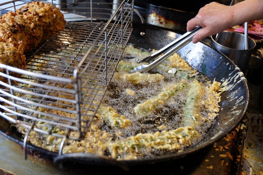 瀝油網上已放置了許多炸好的餐點,像是米腸、蘿蔔糕、炸豆腐等。