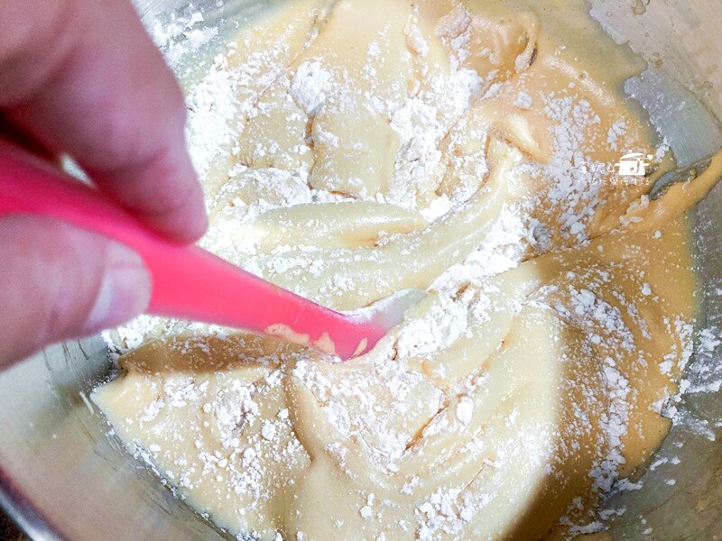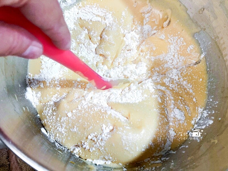 改用刮刀以切拌的手勢,輕巧快速的混拌到看不見粉粒