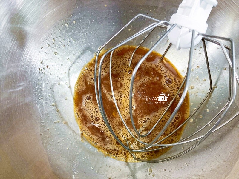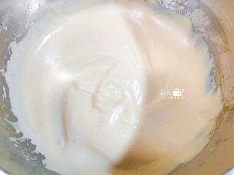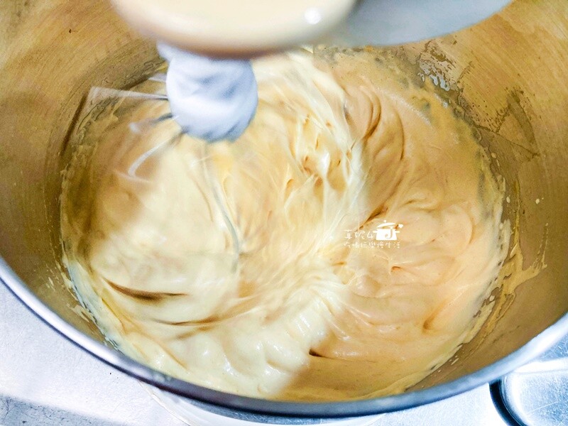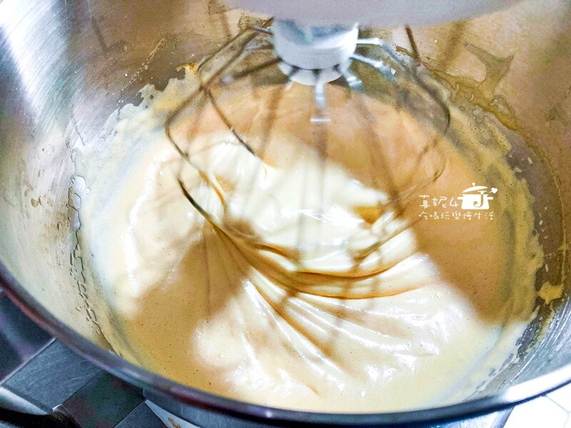 打發過程會看到缸裡的質地由粗到細致,顏色由黃到乳白