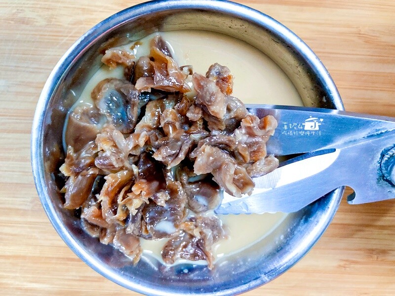 1.桂圓乾浸泡在養樂多裡,大約1小時後桂圓乾會鬆弛膨脹再用剪刀剪成小塊備用