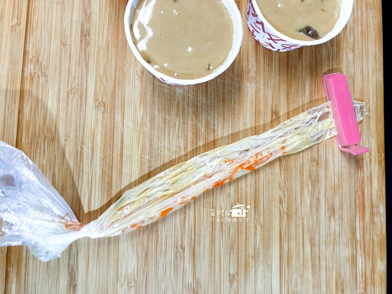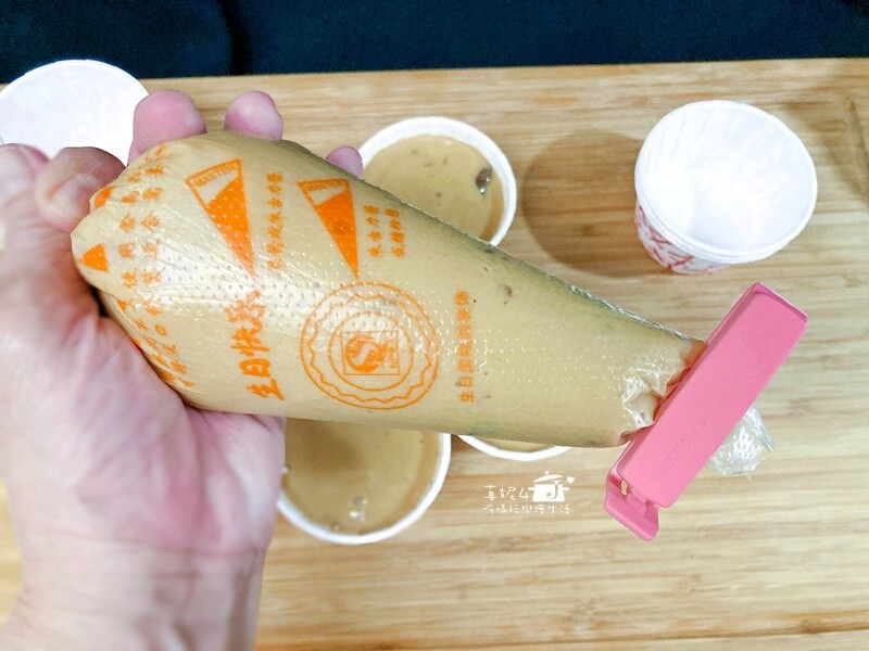 在細的出口用密封夾夾緊,寬口端套入杯壺或類似的容器,填入剩下的麵糊生料