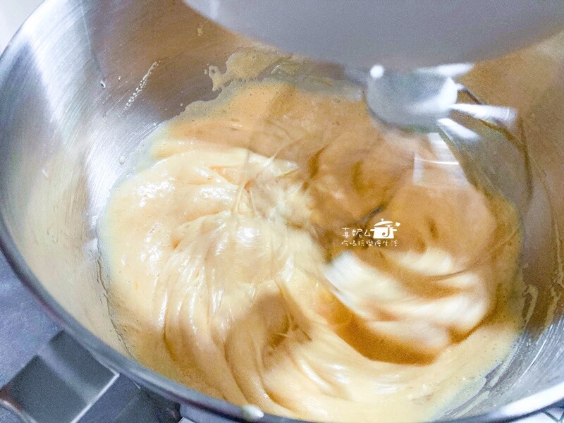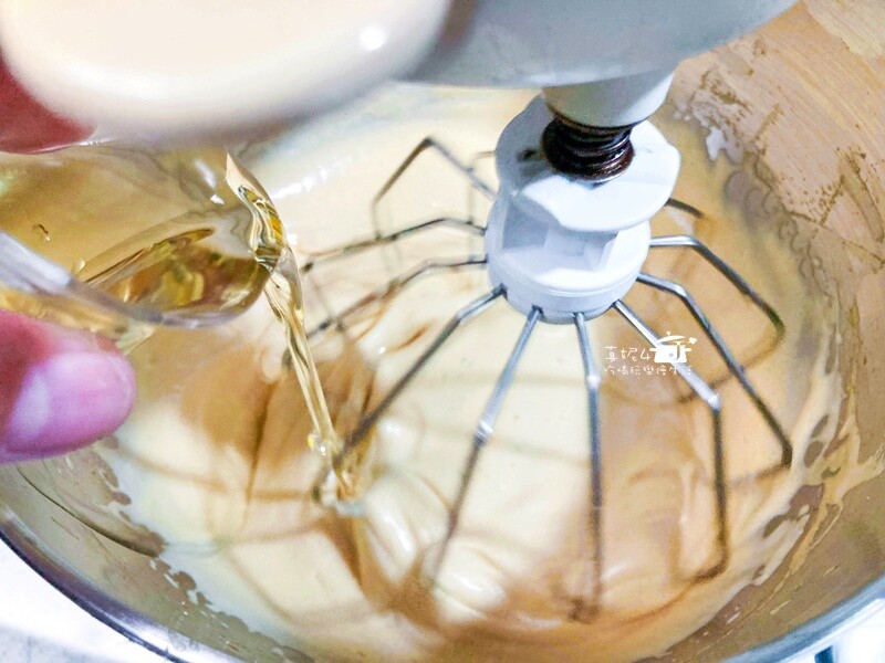 3.沙拉油分次加入打發的麵糊中,調低速讓麵糊和油質均勻的混在一起