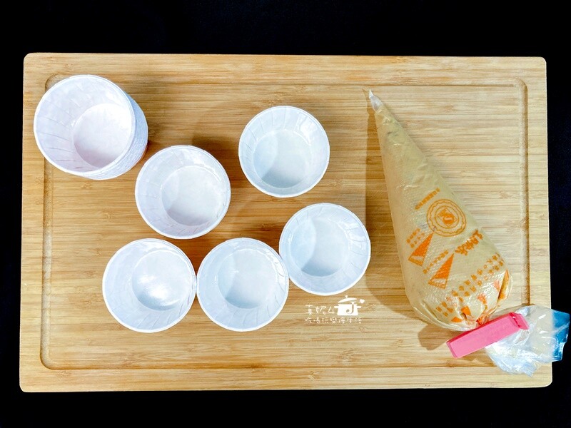 6.調拌完成的麵糊裝入擠花袋,準備填入備好的紙杯烤模