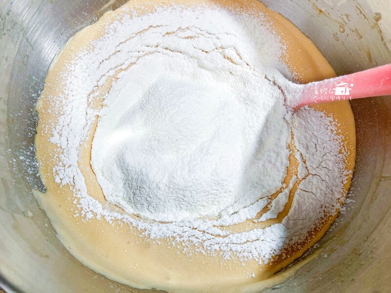 4.篩入低筋麵粉、泡打粉、小蘇打、鹽