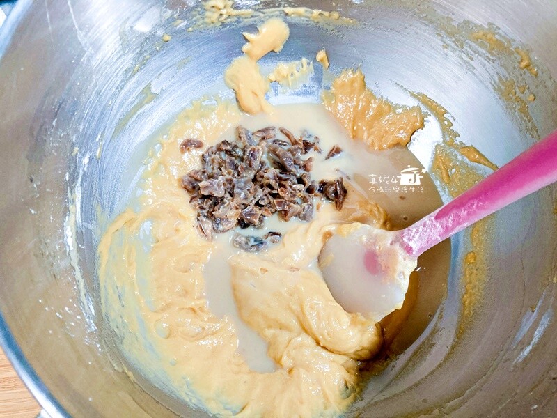 5.加入浸泡後的桂圓乾(連同養樂多一起),再一次輕手快速混拌均勻