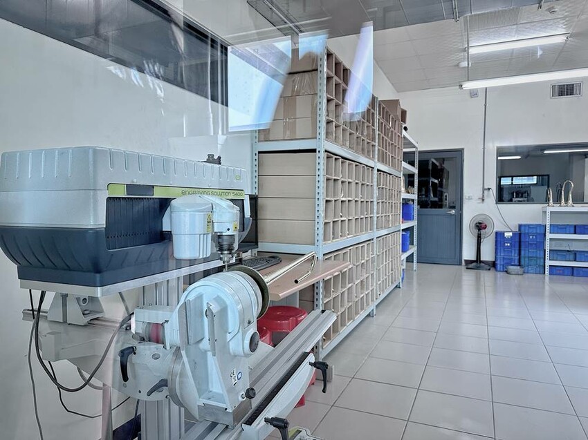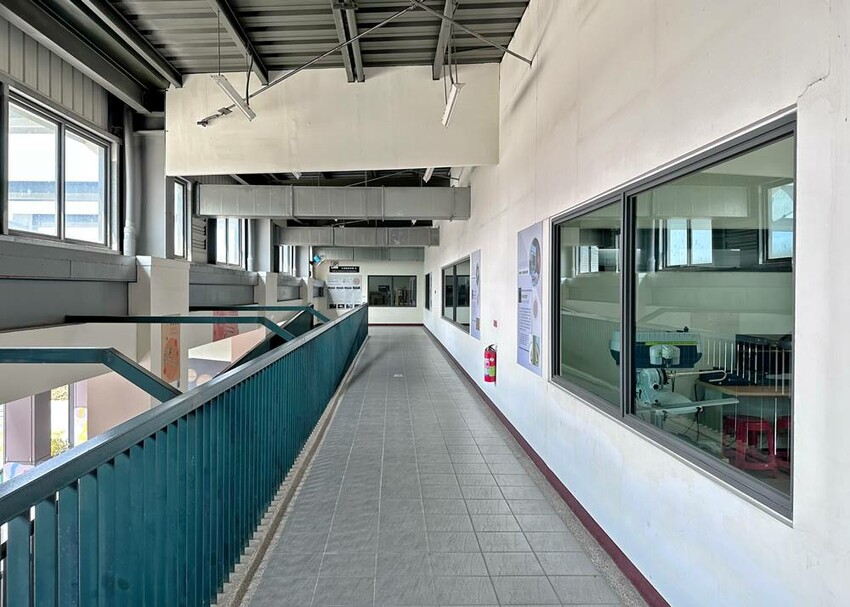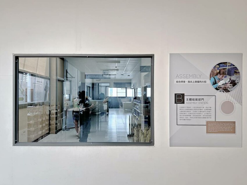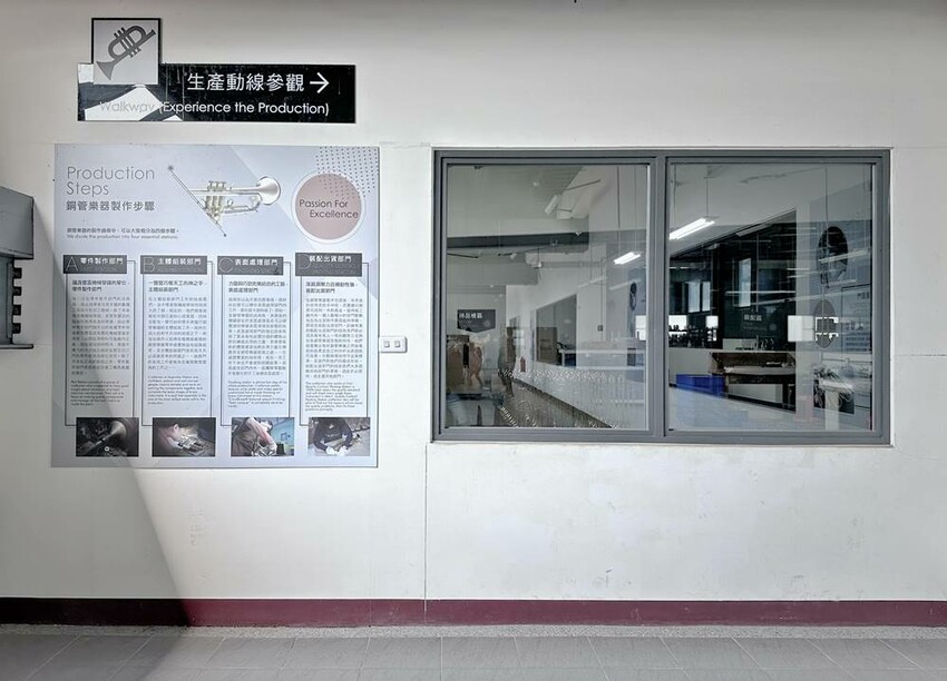 在平日走上二樓是可以看到卡羅爾銅管樂器觀光工廠的生產線在作業的流程,但假日來訪就不能看到,僅能透過櫥窗看到擺放整齊,等待零件製作、焊接組裝、表面處理等流程的樂器。