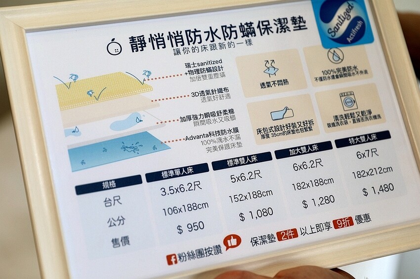 門市也有展示的靜悄悄防水保潔墊 四層結構設計 結構內有防蹣殺菌的SANITIZEDR山寧泰鋅離子、