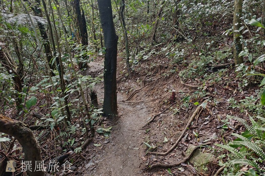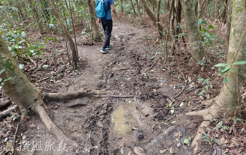 至五指山古道時,正式從七星山系走到五指山系,再走一小段就會抵達內湖區的山區,此段依然是容易濕黏,非常容易滑倒,我們的經驗是,或許可以踩著有落葉處的地方,除了地面會比較穩外,也有較多的摩擦力可以減少滑倒的機會,也會有比較熱心的山友,會在濕滑處鋪上枯枝與落葉,讓大家更好走一些。