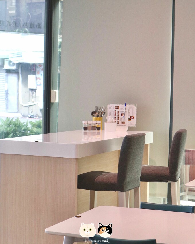 每個桌上都有餐具、菜單跟一些調味料
