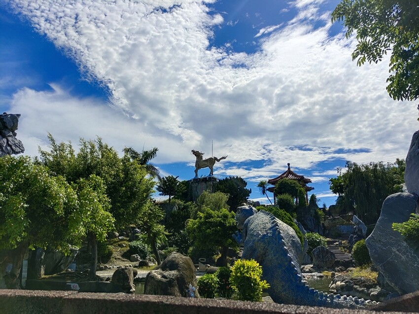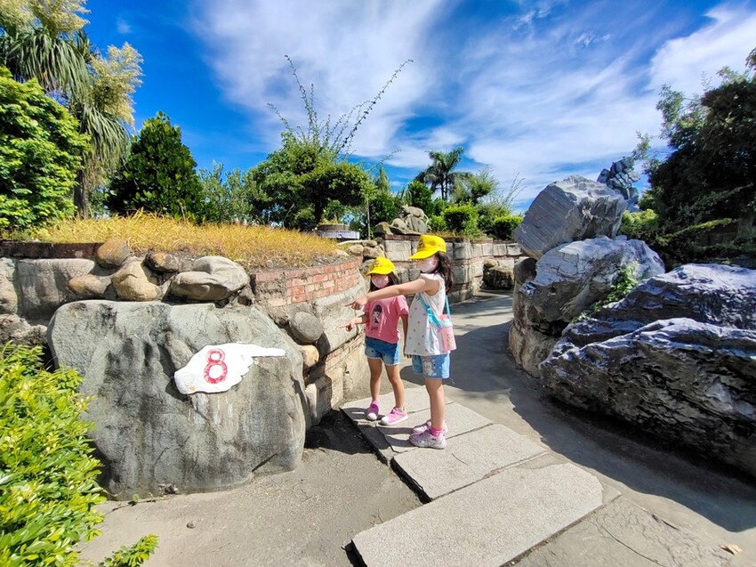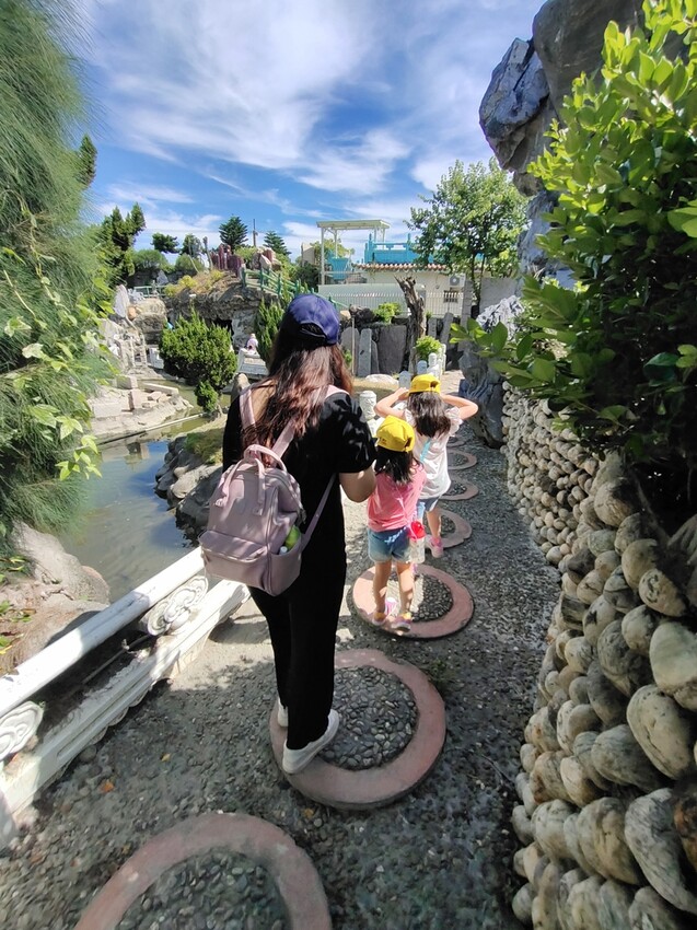 雲林景點「五年千歲公園」是全台面積最大的寺廟主題公園,免門票、好停車,佔地足足有2公頃、共73個景點,有點像在走大型實境迷宮的概念,跟著指標走準沒錯;其中包含不少奇山異石、神仙雕像,甚至還有大恐龍、九龍巨船及最著名的彩虹摩天大橋,很適合邊走邊拍,逛起來其實挺有趣的!我們是環島回程順路來訪,小倆口來到這裡根本當作闖關遊戲在走,一心只想把全部的號碼收集完畢,有考慮過爸媽想走捷徑的心情嗎(笑)~~正常來說全部走完大概會花費90分鐘,托小倆口的福氣,我們只花了60分鐘就闖關成功,且小倆口上車後立刻秒睡,真不愧是孩子的放電天堂!