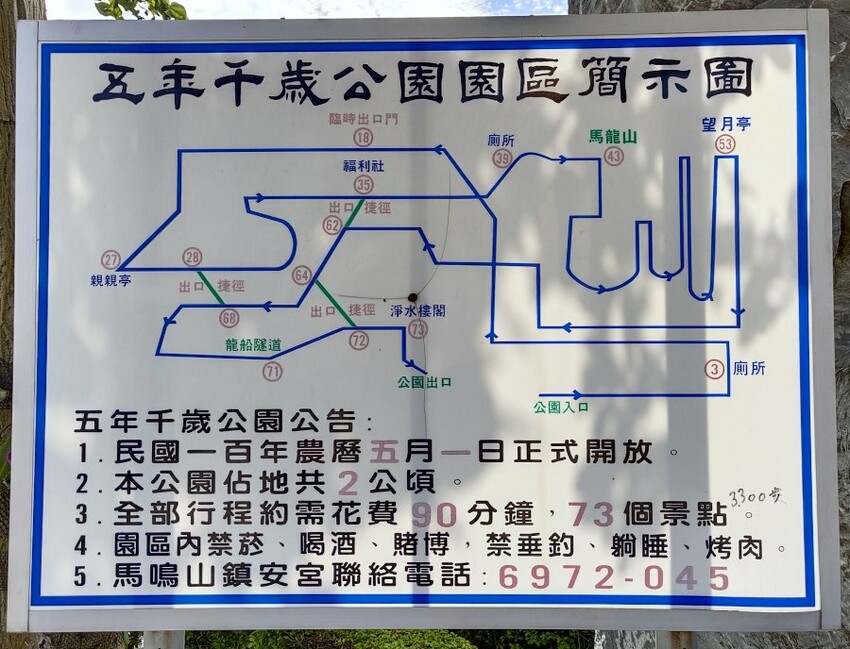 ▼「五年千歲公園」入口處有提供園區簡示圖,這裡佔地2公頃,共有73個景點,走完全程約需花費90分鐘,路線為只進不出,不過中間也有一些捷徑可以走,所以不一定要走完才能繞出來!此外洗手間只有3、39兩個地方有,大家要稍微留意一下位置!