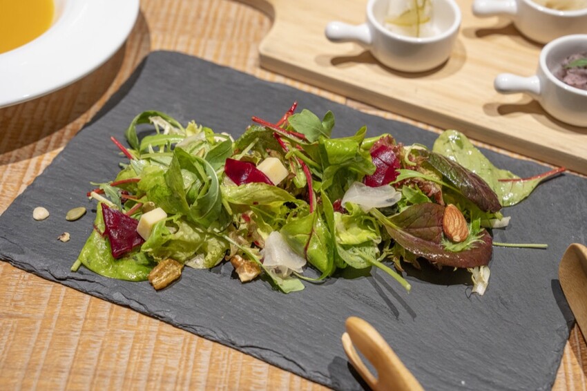 這次RÒU by T-HAM推出的蔬食套餐包含開胃小品、主廚特製沙拉、湯品(堅果南瓜濃湯+手工麵包)、主菜(松露野炒蕈菇+香料烤時蔬)、主食(咖哩植物肉漢堡排飯) $1680,開胃菜的部分有精選開胃小品和主廚特製沙拉,整體吃起來相當清爽!