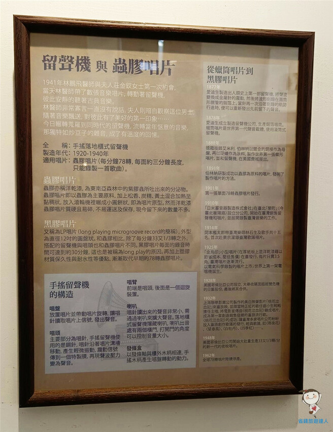 這裡就有一幅文字說明,原來蟲膠和黑膠唱片不只材質不同,連可收錄的音樂多寡也有差異