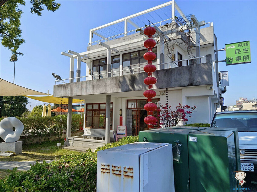 霧峰民生故事館外觀是獨棟的二層樓房,旁邊還有一個醒目的綠色看板