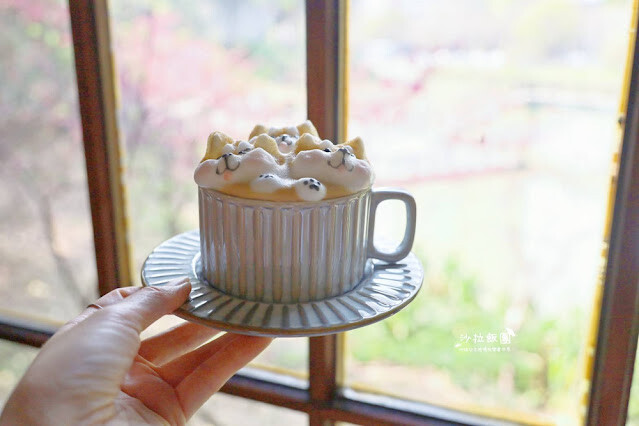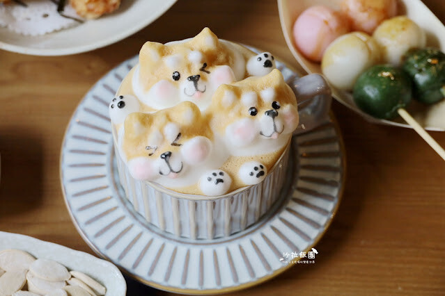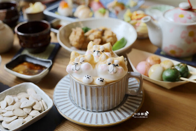 沐浴在咖啡中的柴犬讓人捨不得喝,沙拉一直等到等泡20分鐘後稍微消了才喝,真的太可愛了,好療癒喔