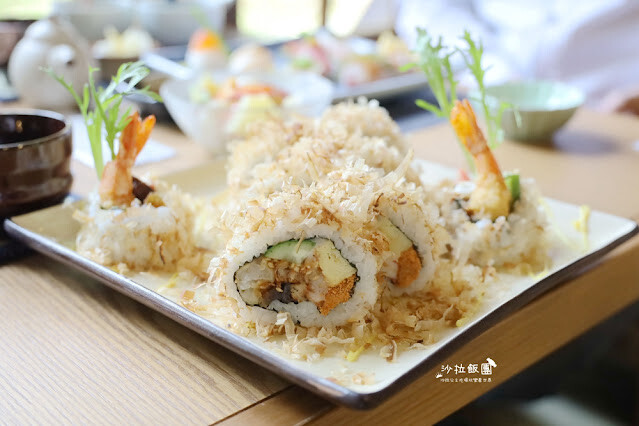 使用炸蝦、鰻魚為主要食材,上面撒了滿滿的柴魚,上桌時柴魚還在壽司上飛舞著
